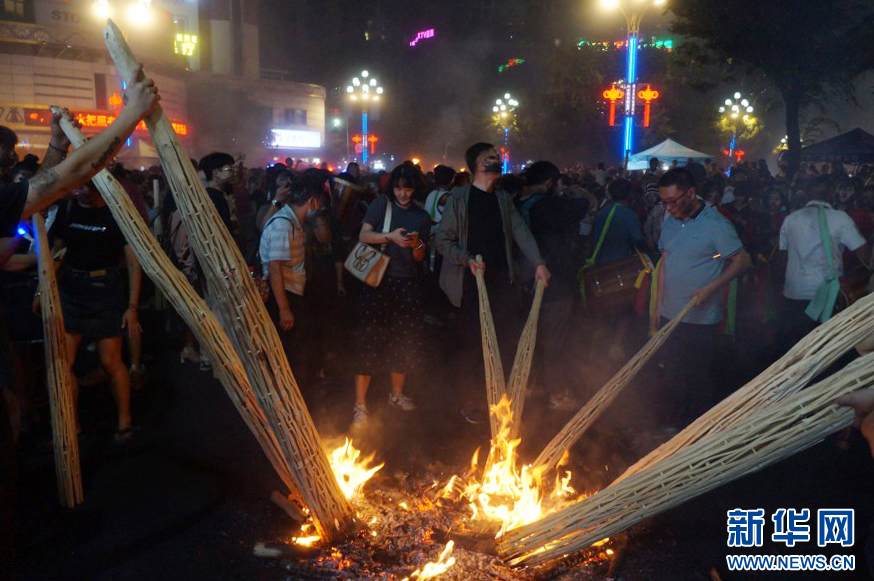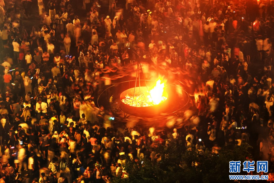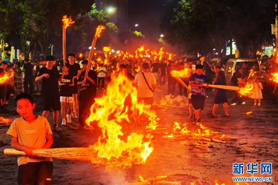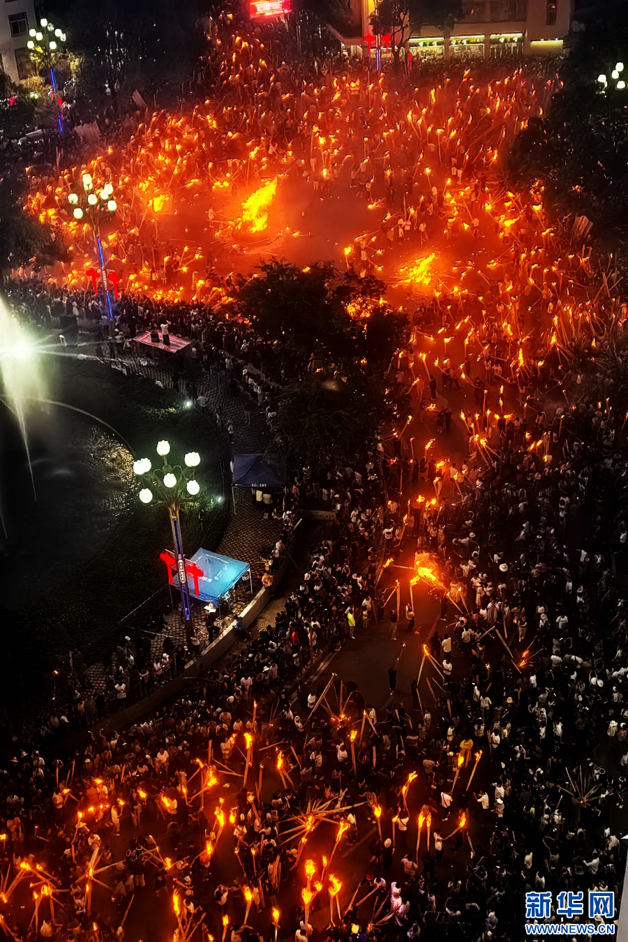 群众点燃火把(7月18日摄)。新华网 范芳钰 摄