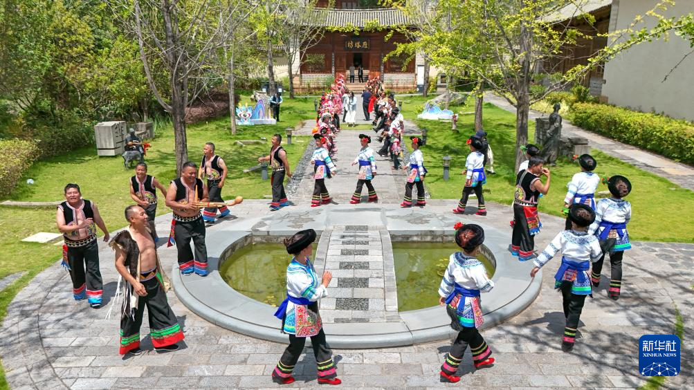 7月18日,彝族打歌队在巍山县文华书院进行排练(无人机照片)。新华社记者 彭奕凯 摄