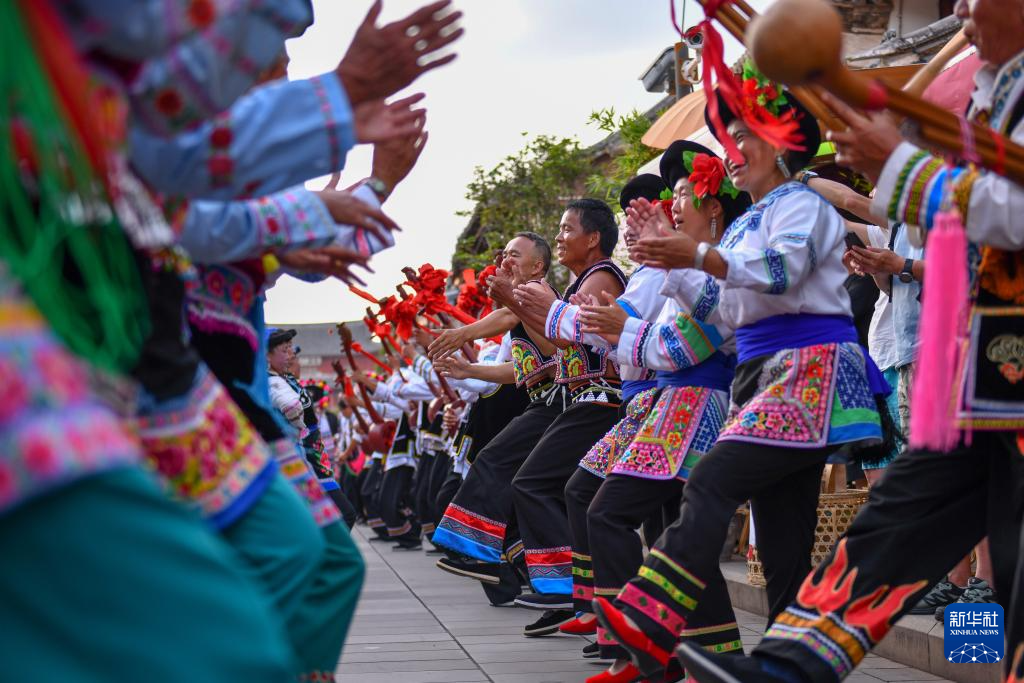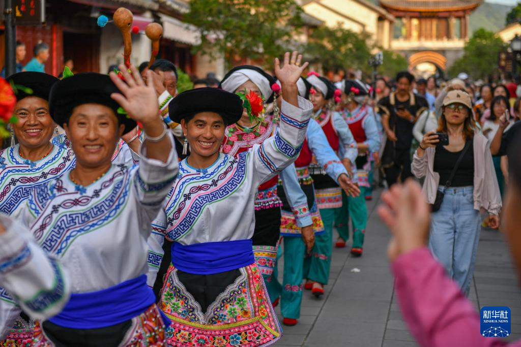 7月18日,彝族打歌队在巍山县南诏古街巡演。新华社记者 彭奕凯 摄