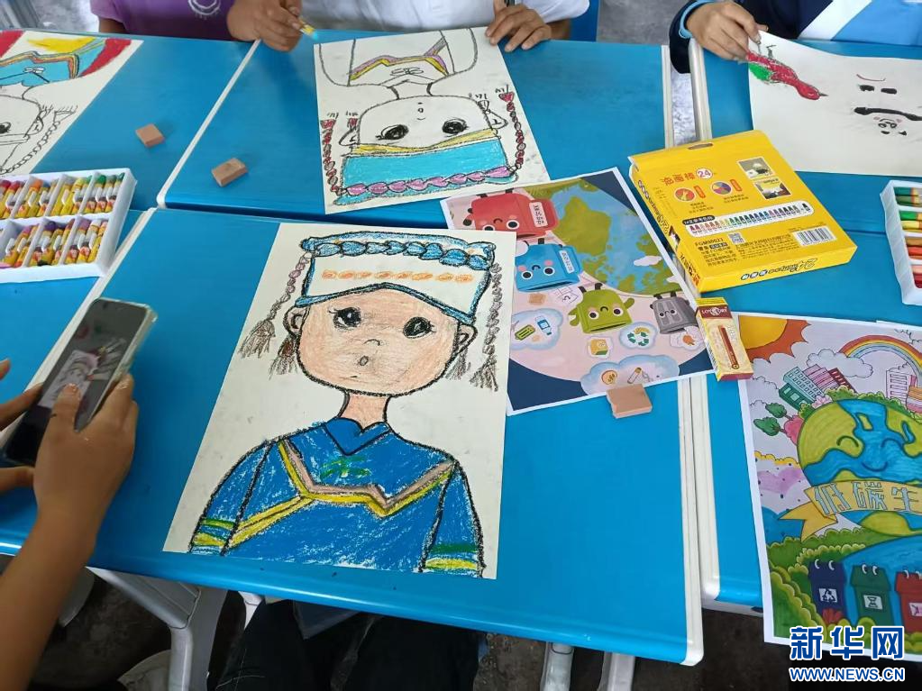 文山学院驻村工作队队员带领孩子作画。(受访者供图)