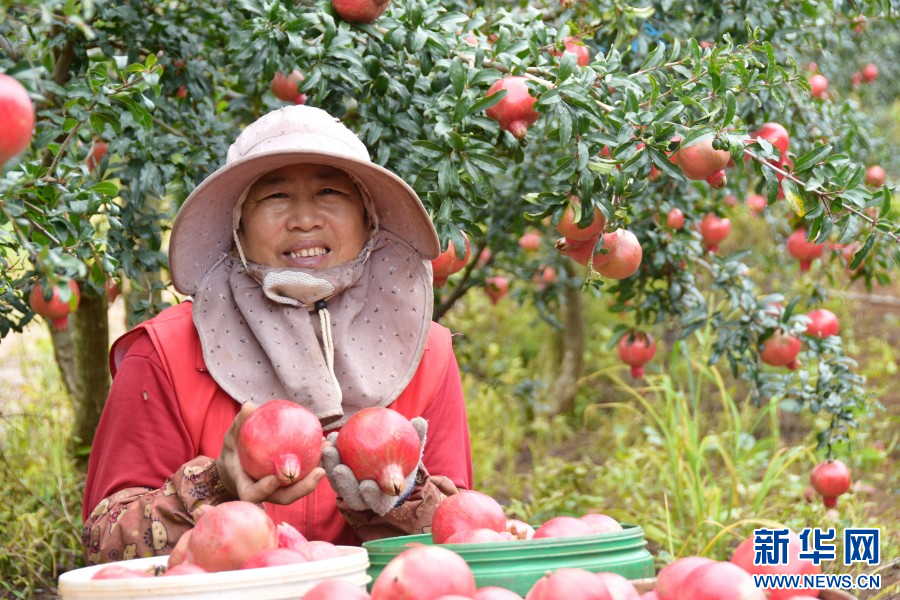 7月26日,在位于云南省红河哈尼族彝族自治州蒙自市的云南六月红农业科技有限公司,果农在展示采摘好的早熟石榴新品种“六月红”。新华网发(薛莹莹 摄)