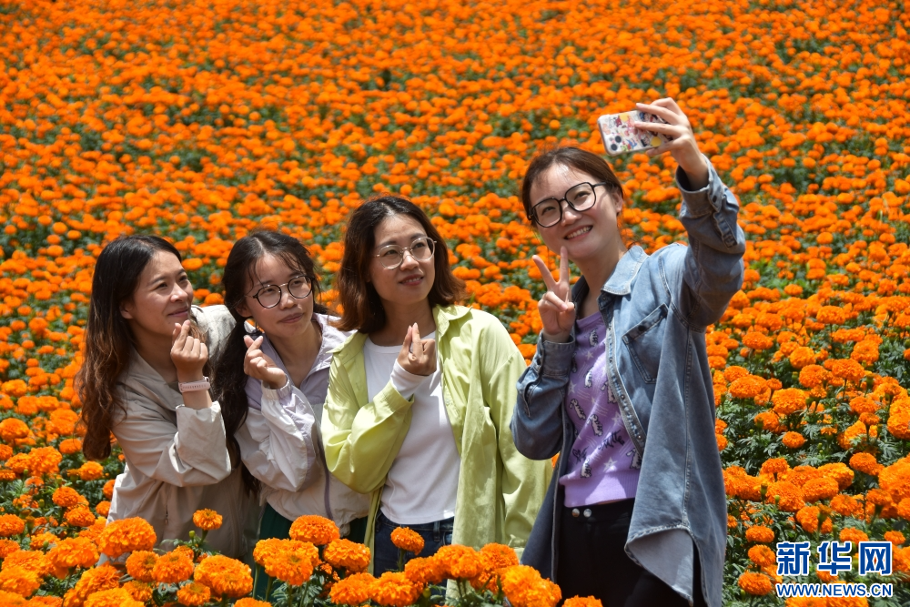 8月10日,游客在云南省红河哈尼族彝族自治州蒙自市冷泉镇兴隆村的万寿菊种植基地“打卡”拍照。新华网发 (薛莹莹 摄)