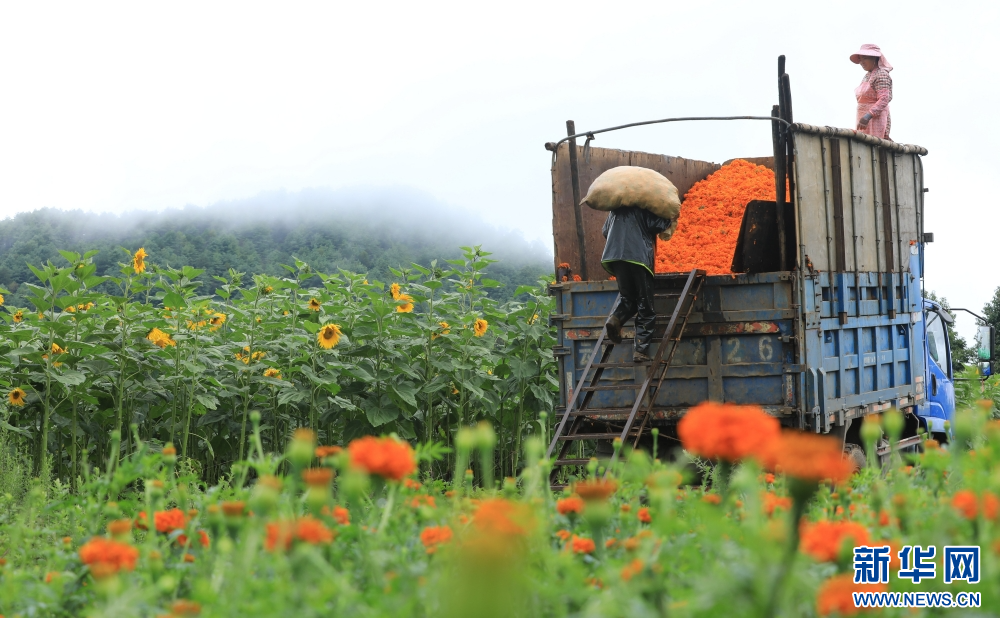 8月6日,在云南省腾冲市明光镇凤凰山,花农将采摘的万寿菊装车。新华网发(龚祖金 摄)