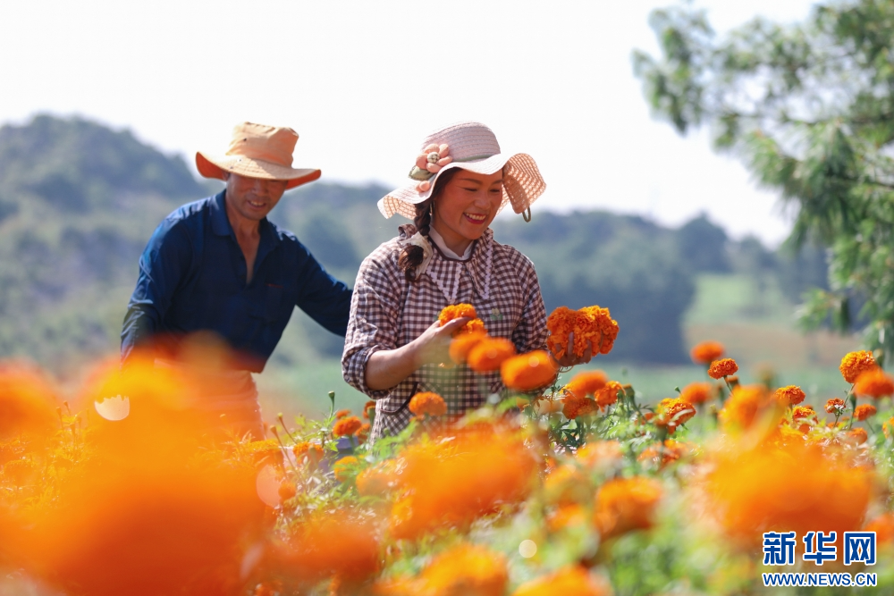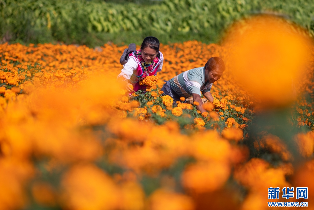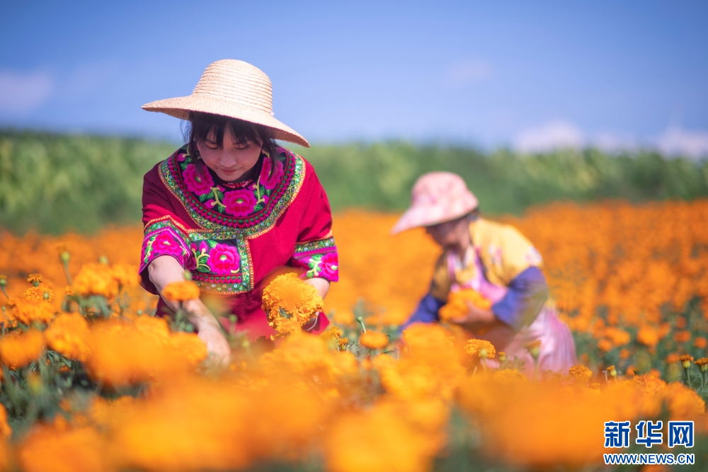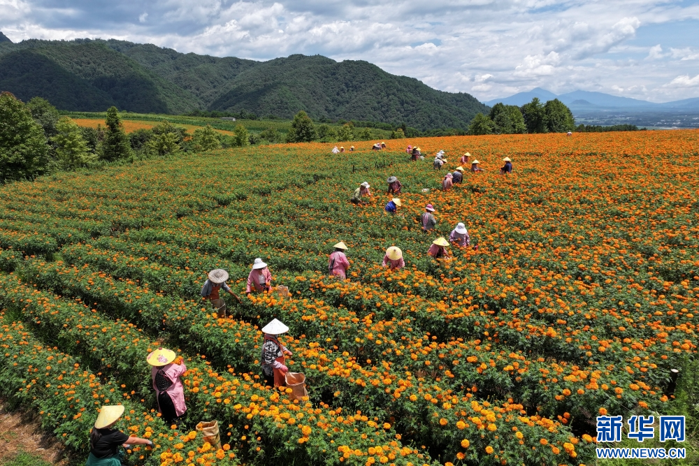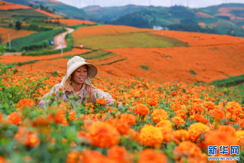 8月5日,在云南省曲靖市陆良县活水乡雨麦红村,花农正忙着采收万寿菊。新华网发 (王勇 摄)