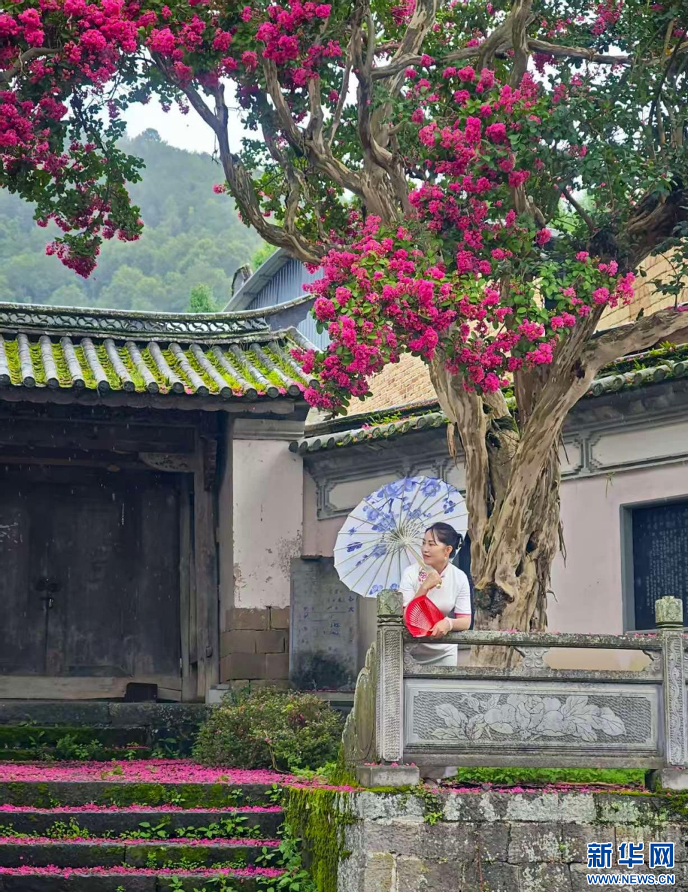 8月8日,云南省腾冲市玉壁村,紫薇花开,吸引游人观赏拍照。新华网发(赵辉 摄)