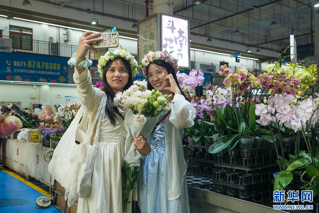 游客在昆明斗南花卉市场拍照打卡(7月13日摄)。新华网发(郑益 摄)
