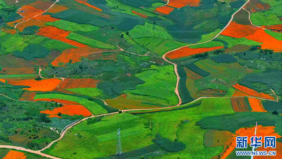 航拍万寿菊花田(8月14日摄)。新华网发(张天宇 摄)