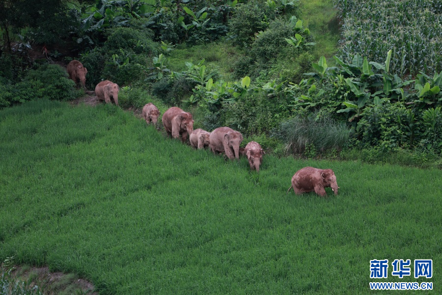 野生亚洲象群在雨中活动(7月1日摄)。新华网发(周晨浩 摄)