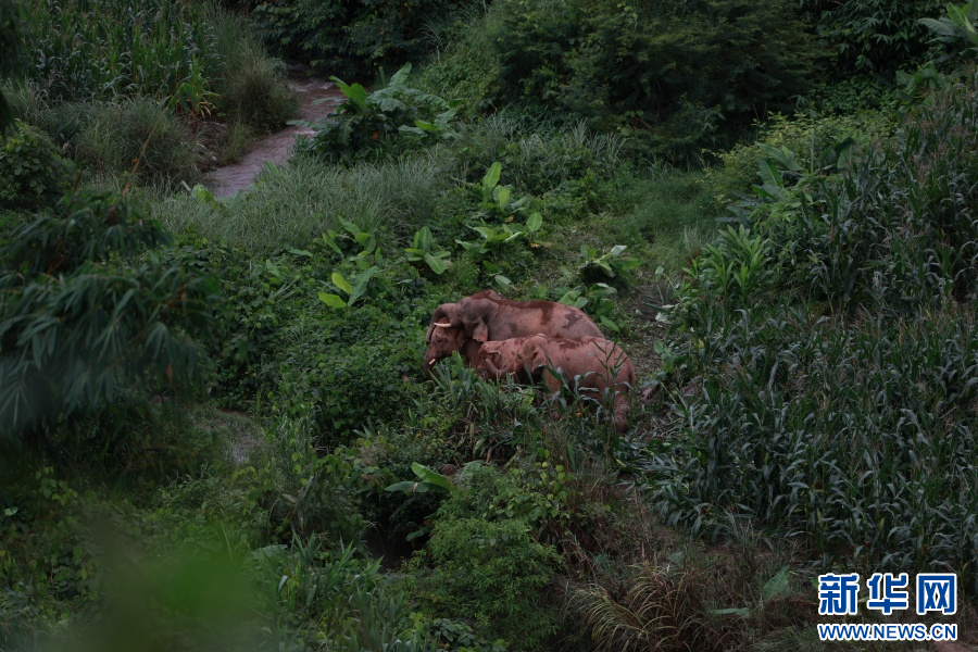 正在觅食的野生亚洲象群(7月7日摄)。新华网发(徐华陵 摄)