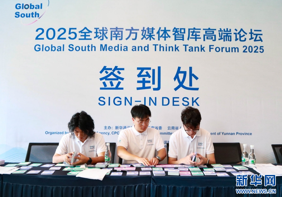 2025全球南方媒体智库高端论坛开幕式会场展台处,志愿者提供周到服务(9月6日摄)。新华网发(刘云 摄)