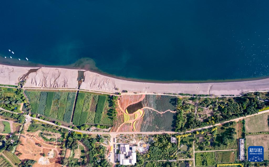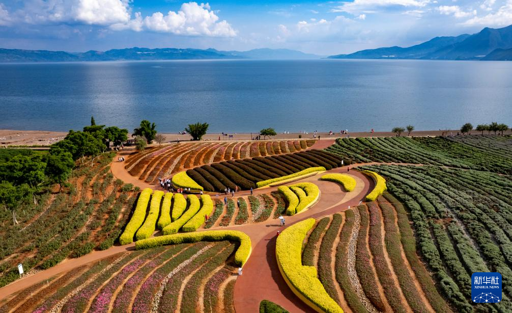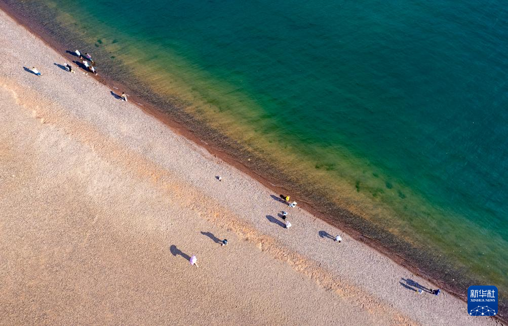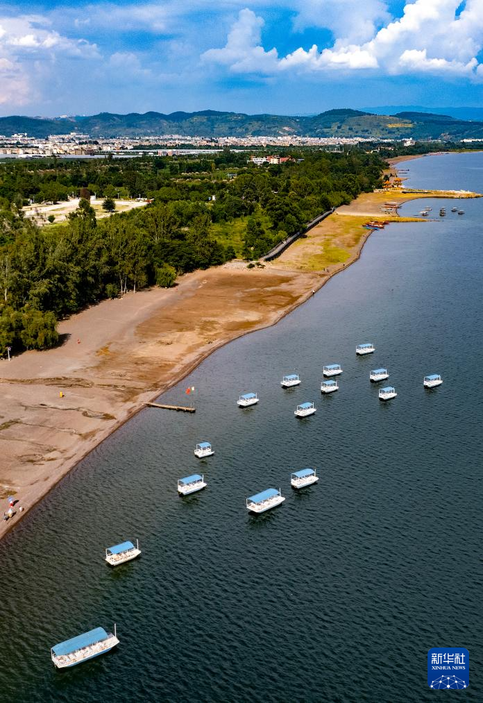 9月8日,游客在抚仙湖畔游玩(无人机照片)。新华社记者 陈欣波 摄