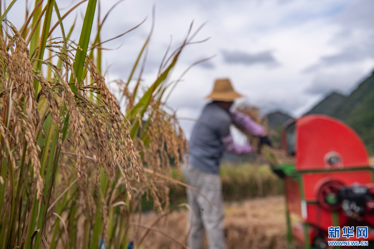 云南省广南县八宝镇,八宝米进入集中收割期,农户收割稻谷(9月15日摄)。新华网发(熊平祥 摄)
