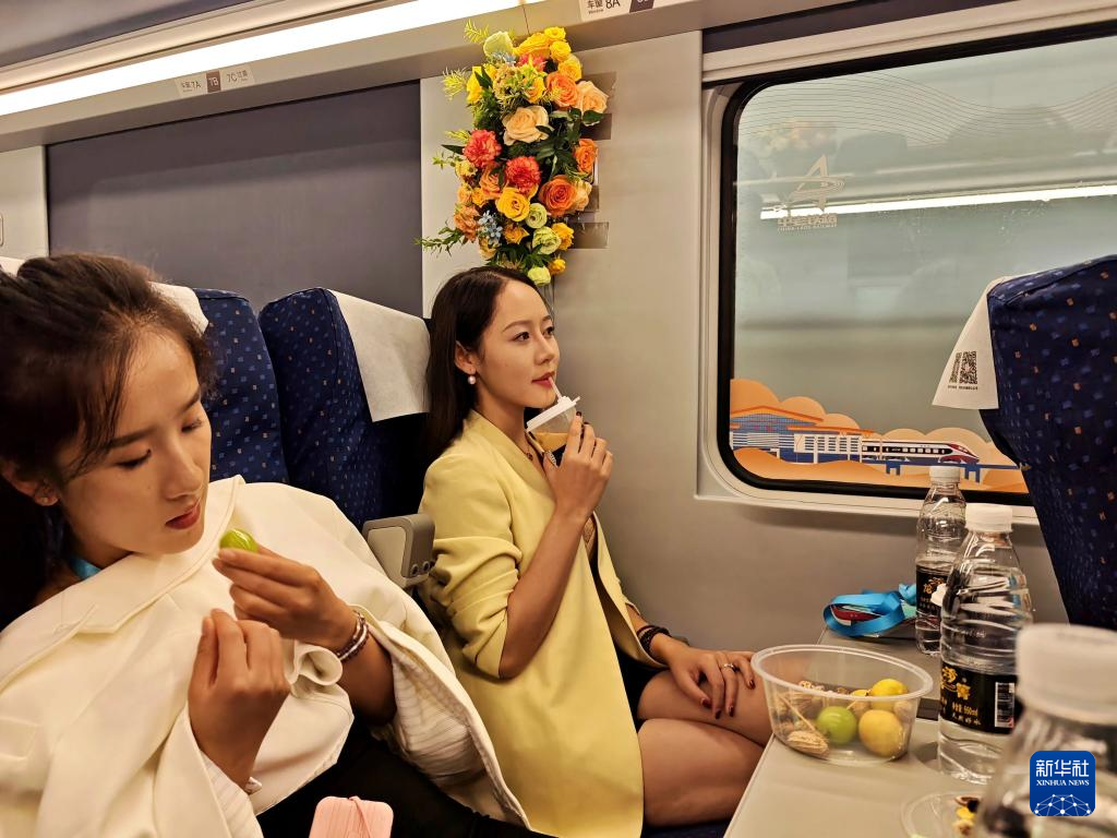 9月20日,旅客在中老铁路列车上品尝咖啡。新华社记者 邢广利 摄