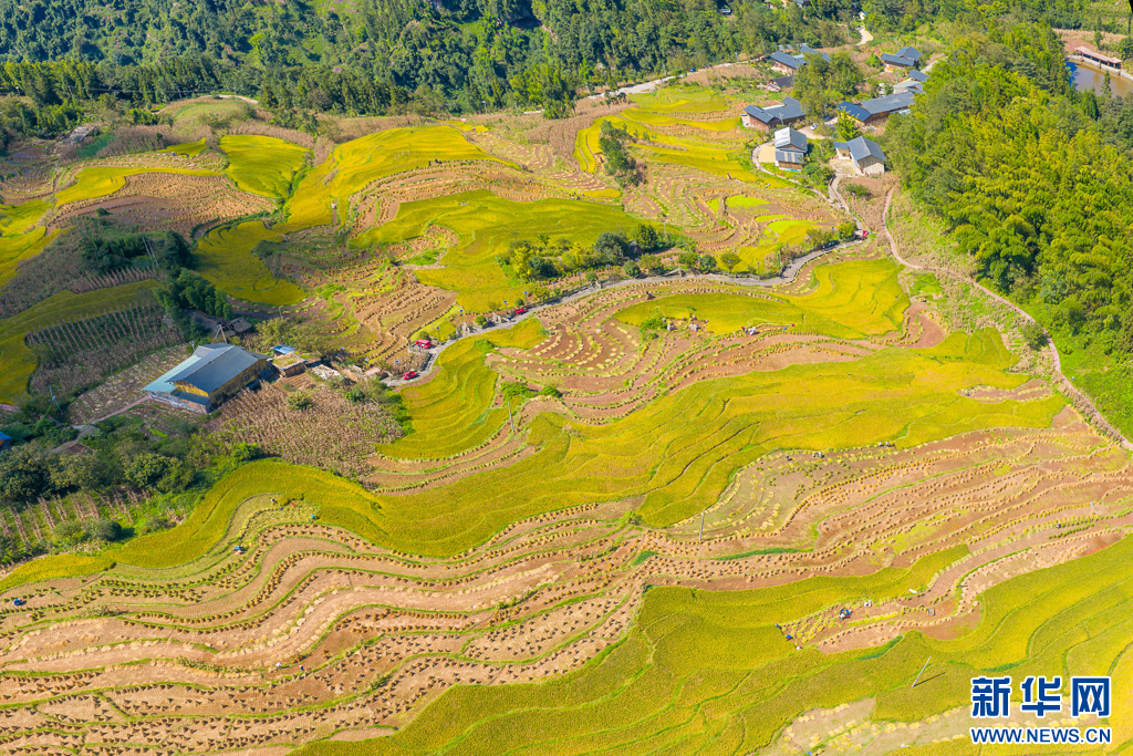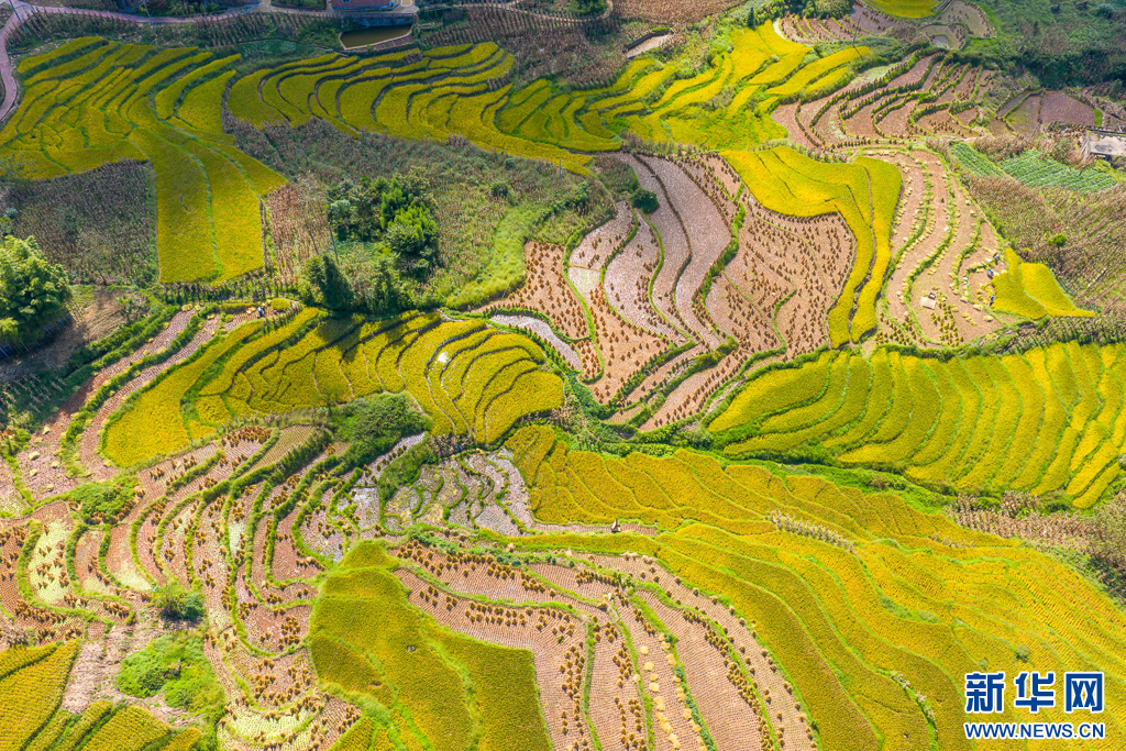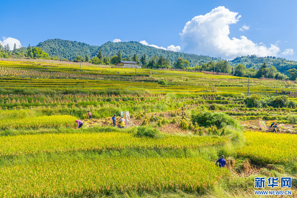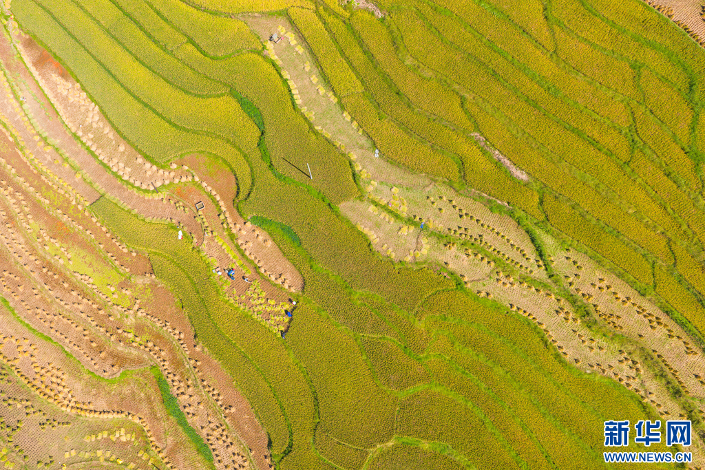 金秋时节,云南省昭通市绥江县中城镇回望村,数百亩高山梯田水稻逐渐成熟,当地群众抢抓晴好天气收割水稻,现场一派喜人“丰”景。(完)
