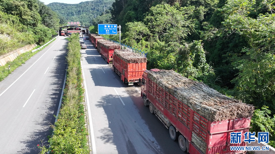 航拍勐满口岸入境满载甘蔗的车辆(10月29日摄)。新华网发(李扬 摄)