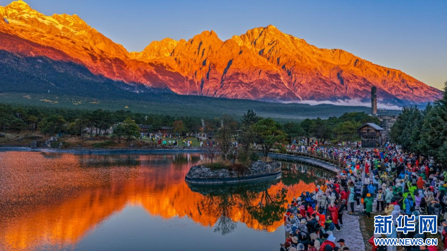 近日,云南省丽江市迎来“日照金山”最佳观赏季,玉龙雪山脚下的观景点人头攒动,游客和摄影爱好者在晨风中等待着一场壮丽的“日照金山”。