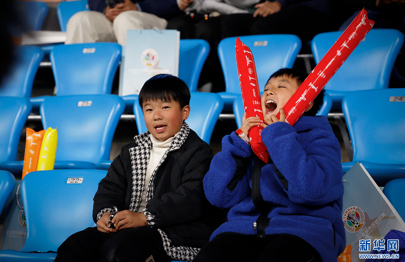 与家长一同为球队助威的“小球迷”(11月29日摄)。新华网发(丁凝 摄)
