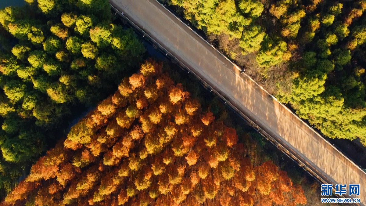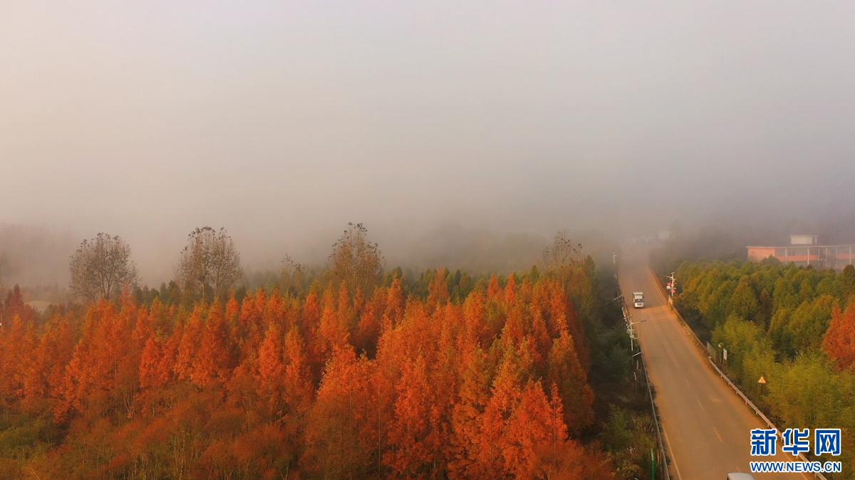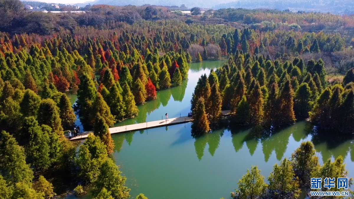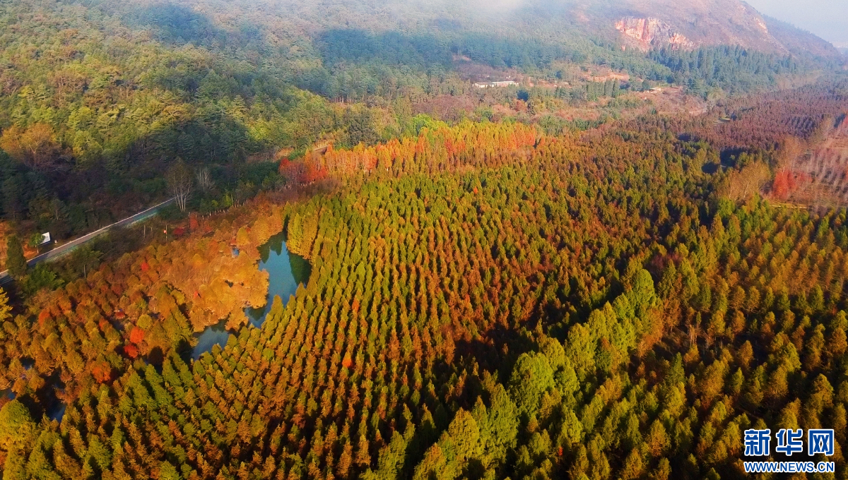 冬日暖阳下,昆明市盘龙区滇源街道甸尾村的水杉林渐渐变红,水杉依湖而植,枝叶间漏下的光影洒在湖面上,美好治愈。从空中俯瞰,漫山彩林与云雾交融,呈现出五彩斑斓的旖旎风光。(昆明市盘龙区融媒体中心)