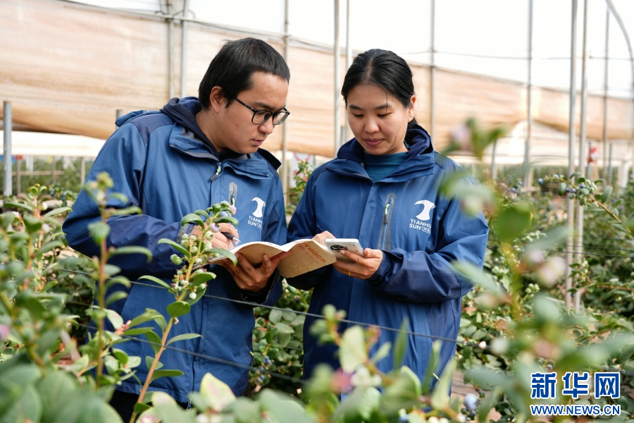 李金在蓝莓基地内与工人交流(12月18日摄)。新华网发(常一鸣 摄)