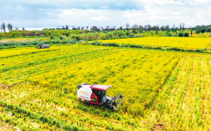 收割机在稻田中往来穿梭。记者 王俊星 摄